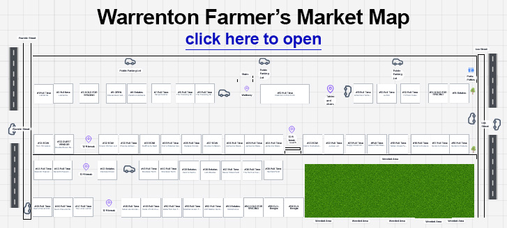 Saturdays mean GREAT FOOD at the Warrenton Farmers Market! Featuring all-locally grown and produced fruits, vegetables, poultry, pork, beef, eggs, pies, breads and more.
